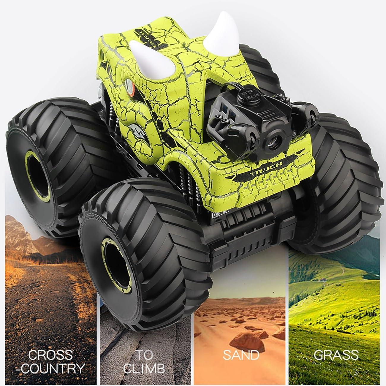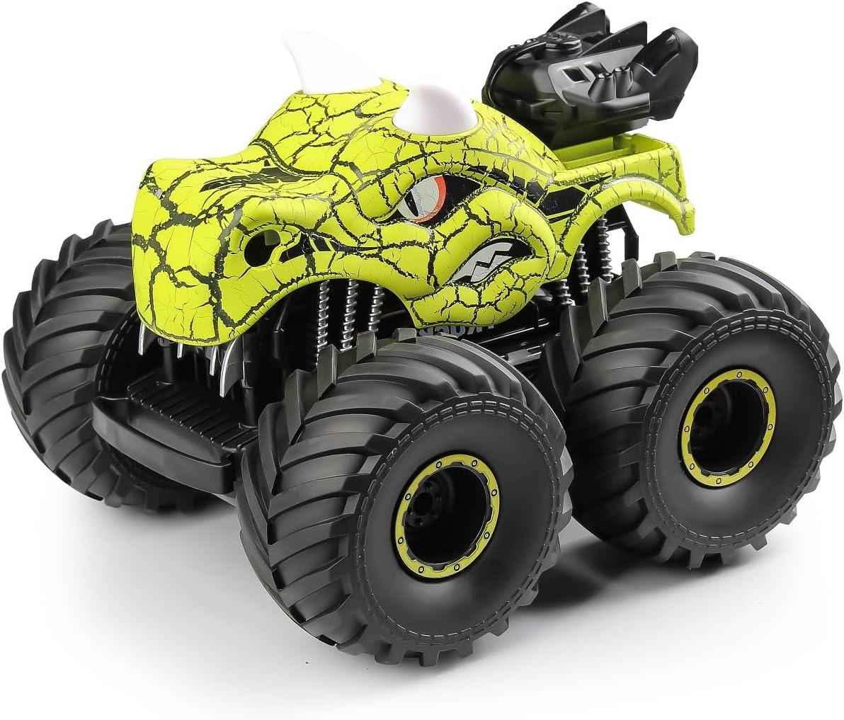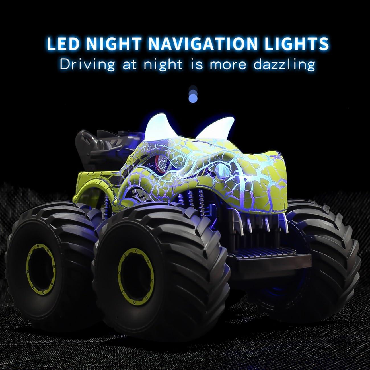 DINOSAUR RC CAR TOYS: Spray, Toggling Cool Lights, Dinosaur sounds ON/OFF, Upright moving and rotation in place at 360 degrees & Car body texture about to burst + The basic skills that ordinary remote control cars should have. Will bring a different driving experience to your kids. Nice presents for kids ages 6+.