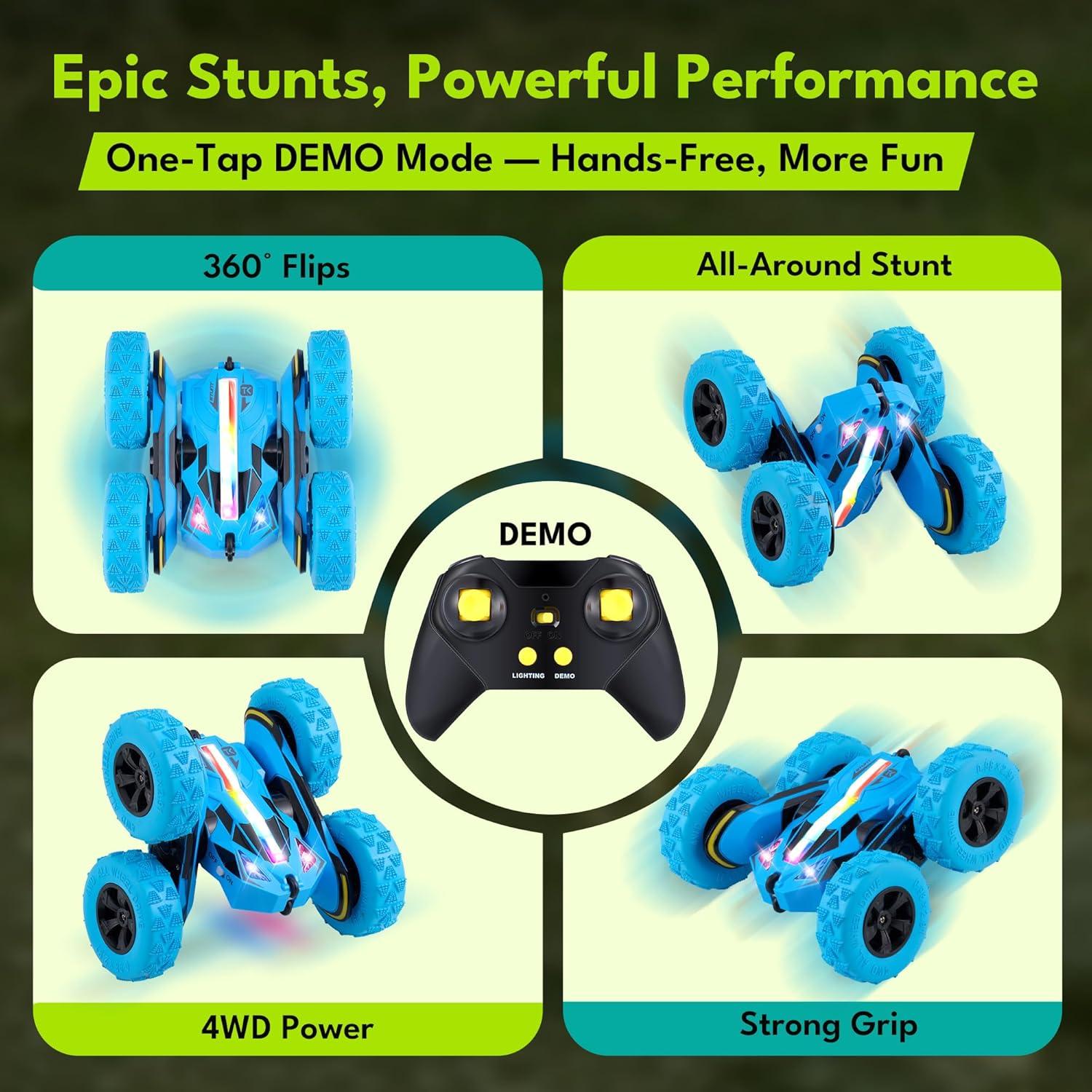 Threeking Remote Control Car RC Cars Toys for Boys Girls Ages 6-12, Upgraded USB-C Modular Batteries, 4WD Stunt Car with Breathing Soft Lights, Double-Sided Driving & 360° Flips, Presents Gifts, Blue(Up-green)